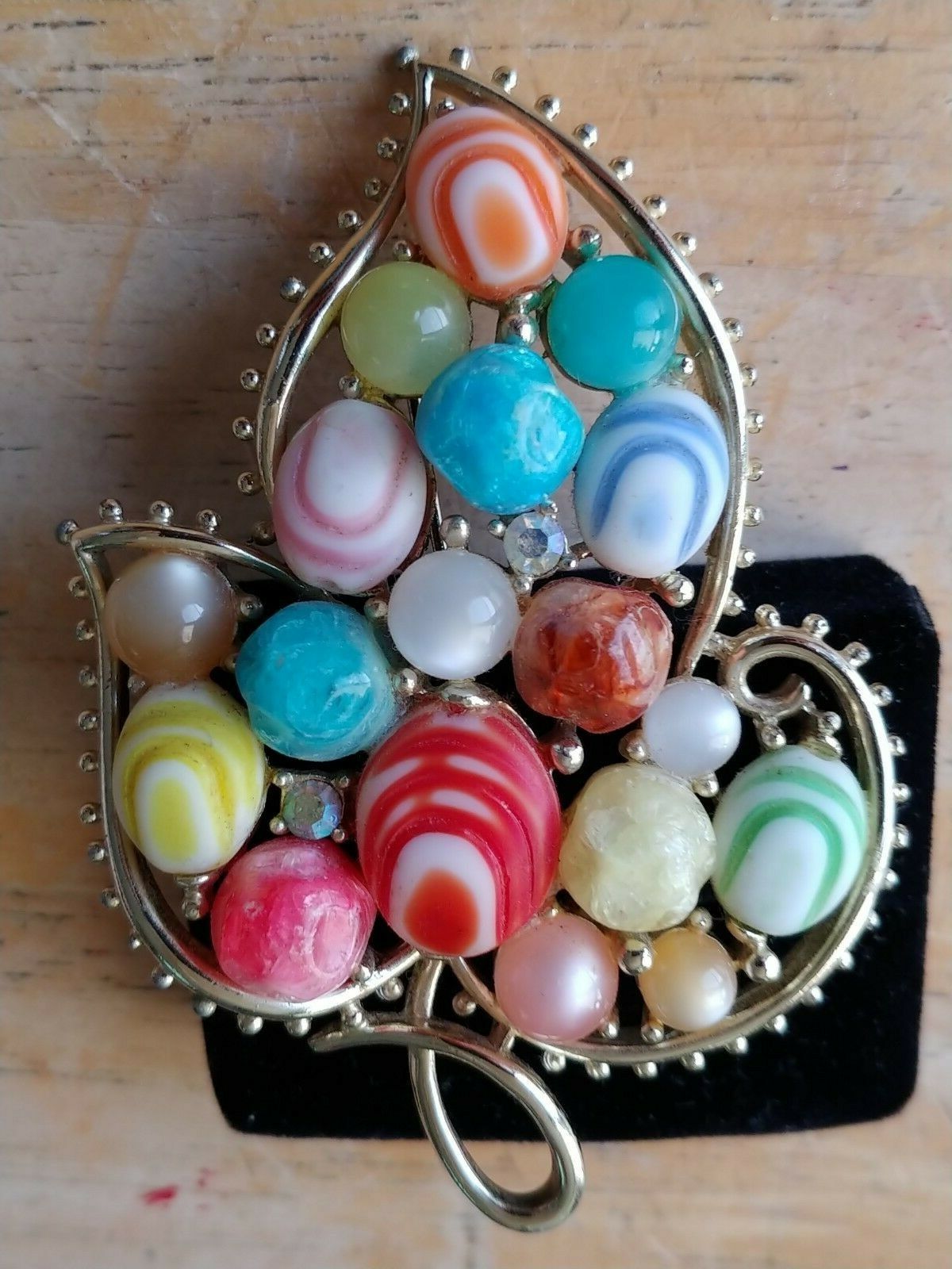 Title (ebay affiliate link): UNIQUE Candy Stripe Milk Glass and AB Rhinestone Goldtone Leaf Brooch