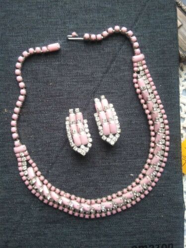 Title (ebay affiliate link): Vintage KRAMER of NY PINK MILK GLASS AND RHINESTONE NECKLACE AND CLIP EARRINGS