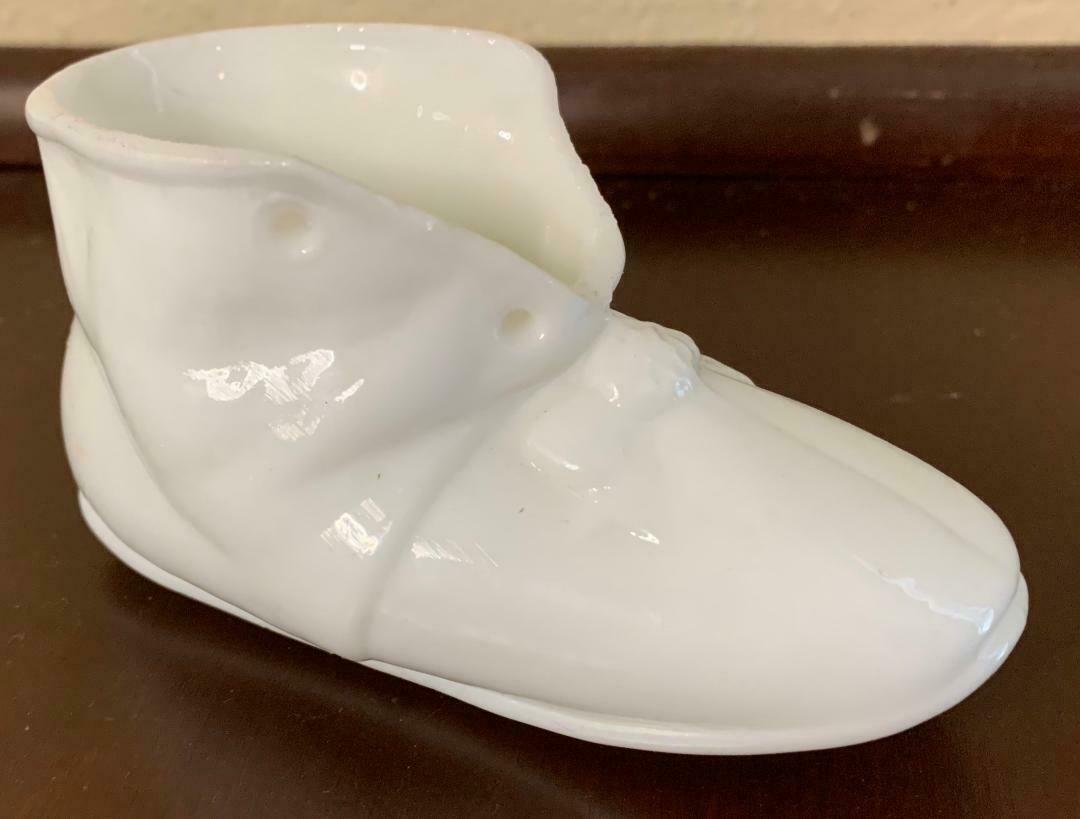 Title (ebay affiliate link): Vintage Milk Glass White Baby Booty Bootie Shoe Sock Bow Flowers Smooth Rare Old