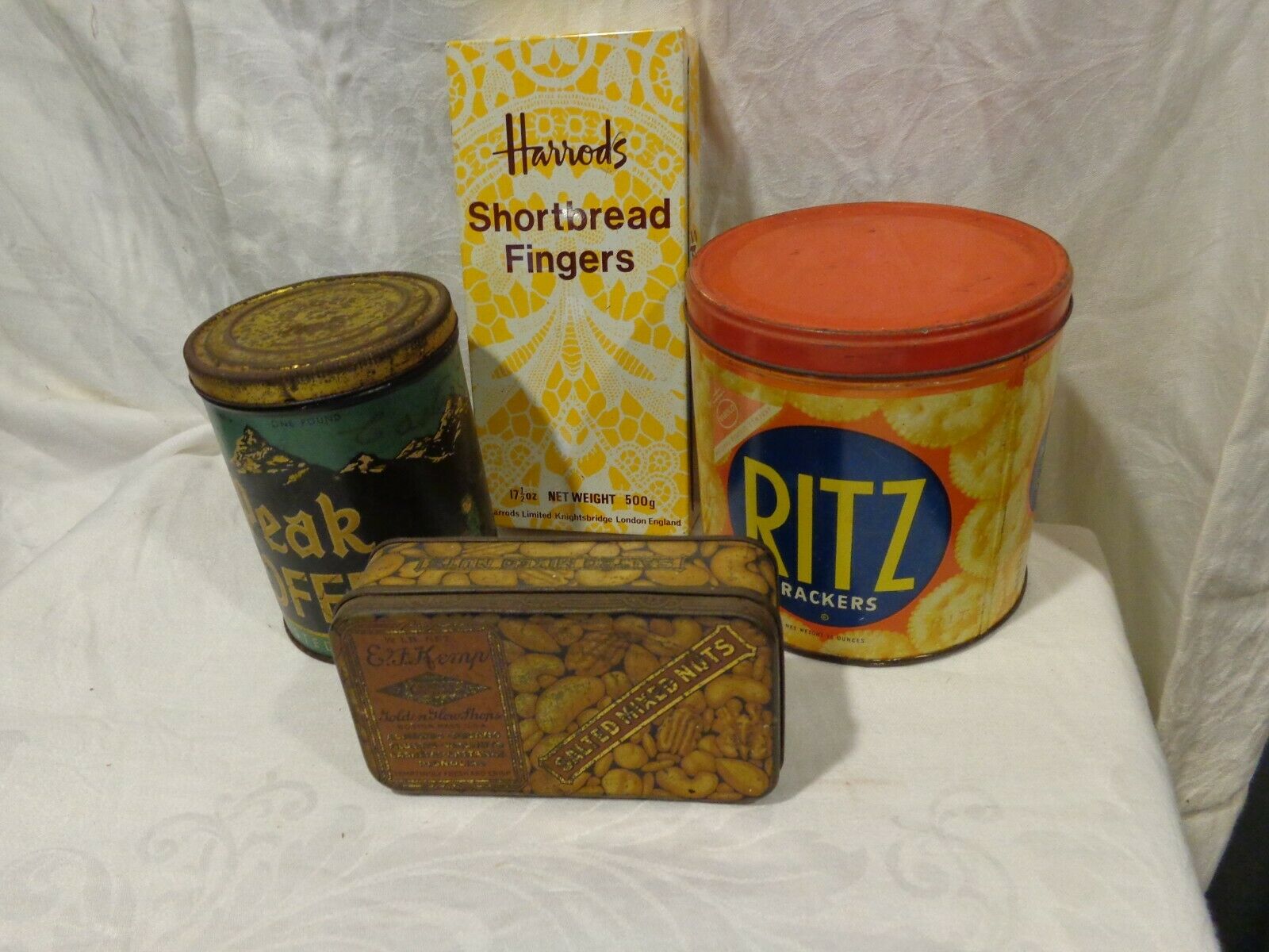 Title (ebay affiliate link): 4 Vintage Kitchen Tins - Peak Coffee Ritz Crackers E.F. Kemp Nuts Harrods