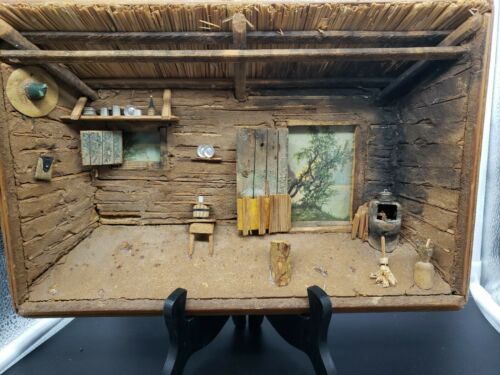 Antique Vintage Folk Art Primitive Inside Wood Log Cabin Rustic House, Hand Made