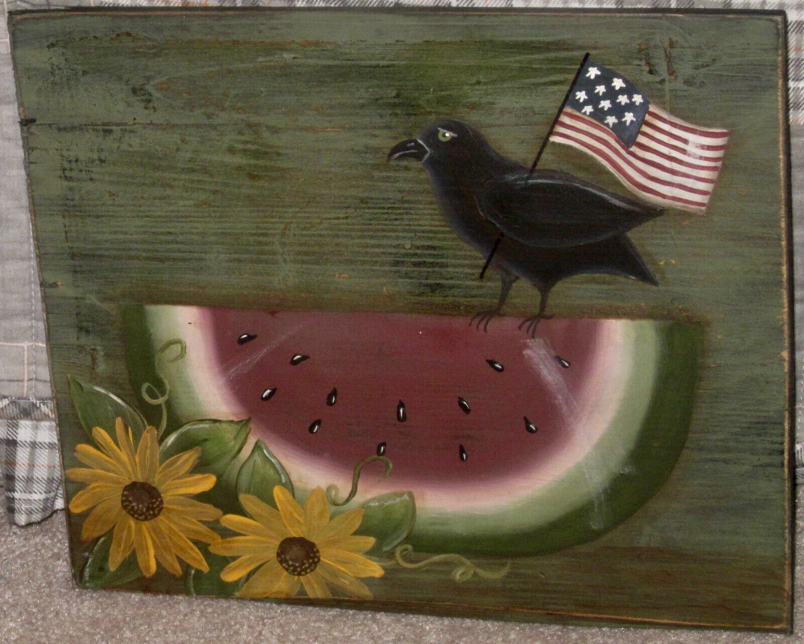 Title (ebay affiliate link): *~*PRIMITIVE*~* HP FOLK ART WATERMELON * SUNFLOWERS * CROW *~* RECLAIMED WOOD