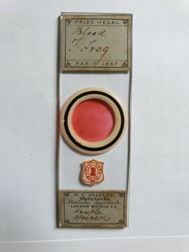 Title (ebay affiliate link): FINE ANTIQUE VICTORIAN MICROSCOPE SLIDE BY COLE "BLOOD OF FROG"