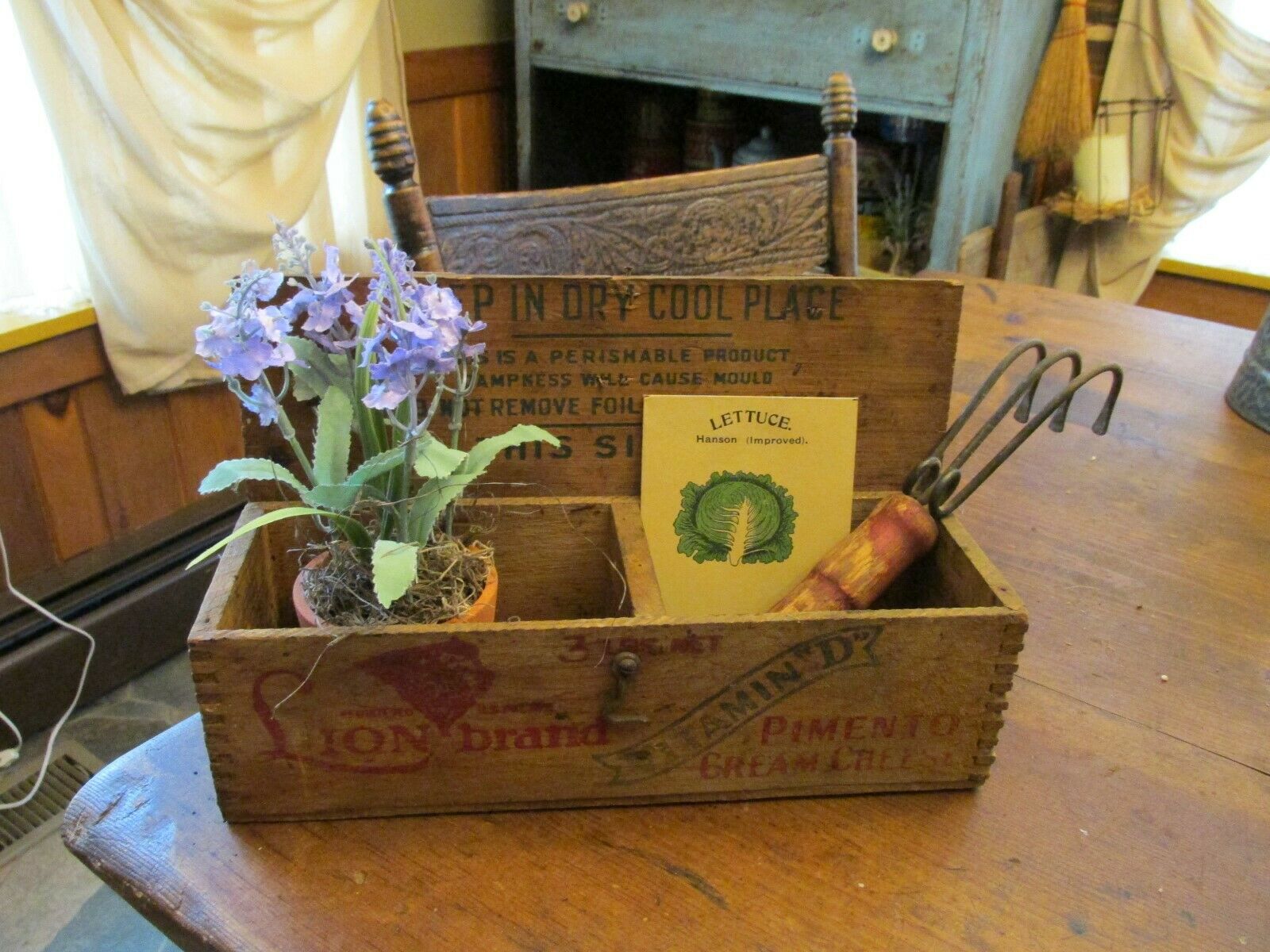 Title (ebay affiliate link): Vintage Garden Farm Hand Tool Old Wooden Cheese Box w/Seed Pack