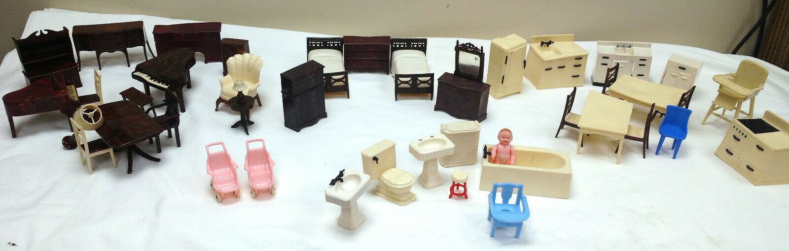 Title (ebay affiliate link): Vintage Lot of 43 Pcs Plastic Doll House Furniture 4 Rooms Renwal Products