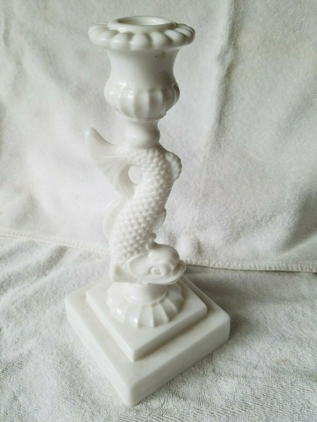 Title (ebay affiliate link): **Antique Imperial Milk Glass Candle Stick Holder Dolphin or Fish Motif**