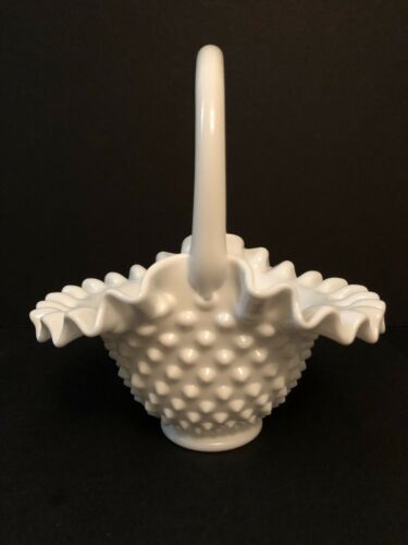 Title (ebay affiliate link): VTG FENTON WHITE MILK GLASS HOBNAIL BASKET-CRIMPED RUFFLED EDGES-8"