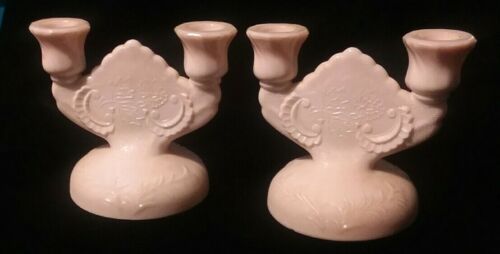 Pair Jeanette Shell Pink Milk Glass Double Candle Holder Lombardi Pattern