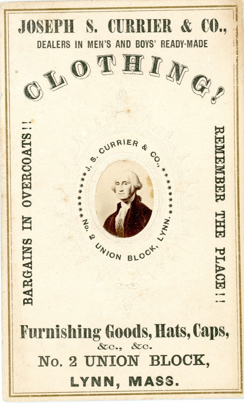 ANTIQUE JOSEPH CURRIER & CO. ADVERTISING TRADE CARD - GEORGE WASHINGTON - MA