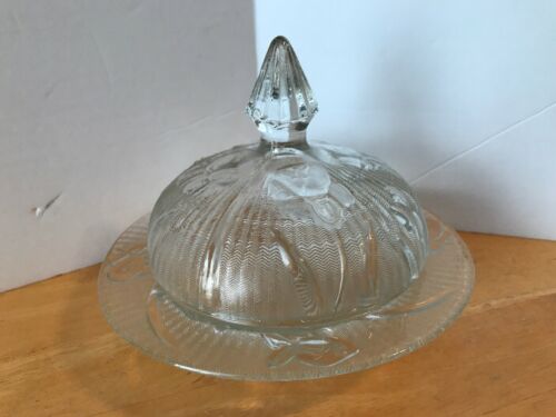 Jeannette Glass Iris & Herringbone Round Butter Dish 4 1/2" Tall 5 3/4" across