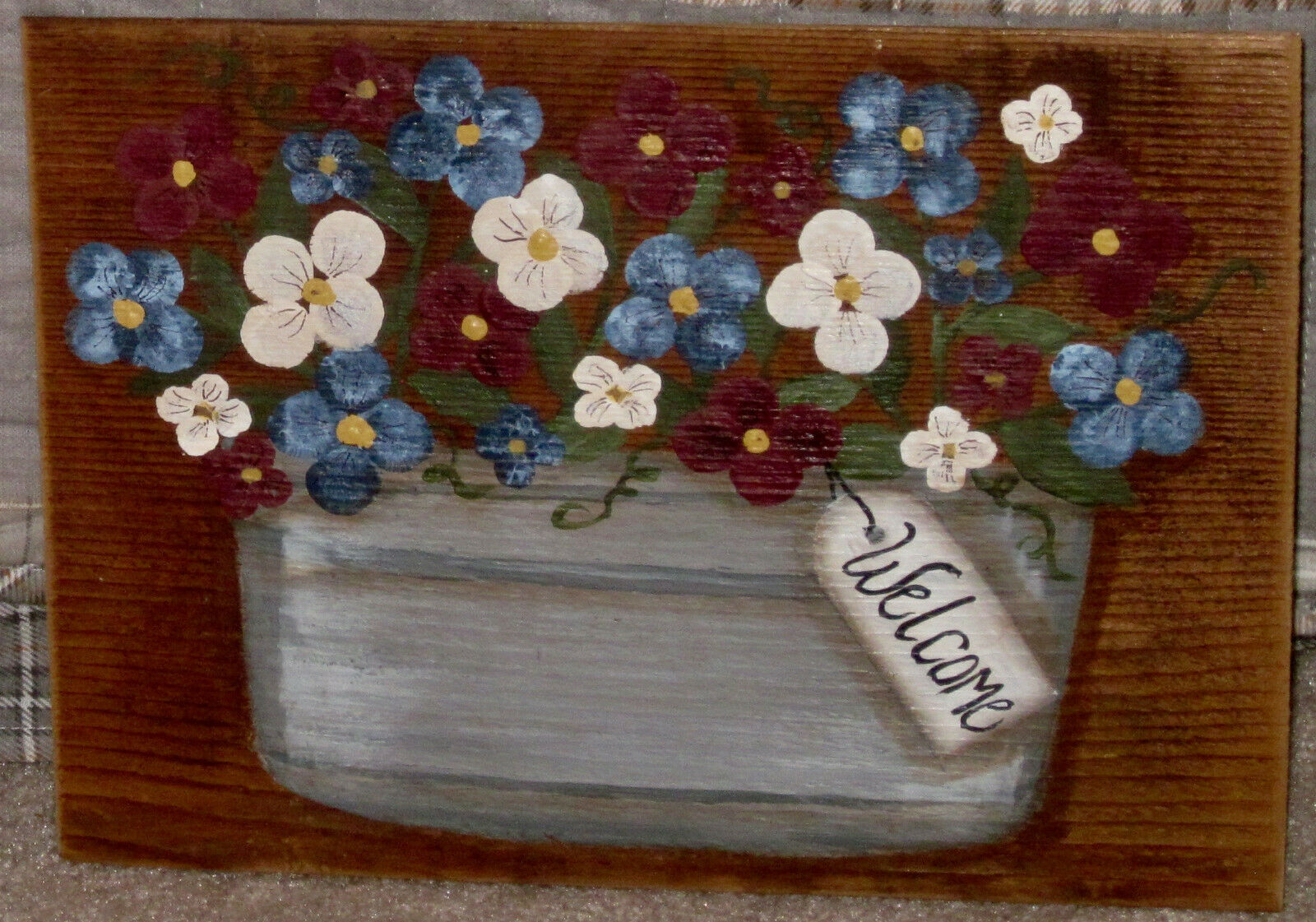 *~*PRIMITIVE*~* HP FOLK ART PRIM PLANTER OF FLOWERS *~* WELCOME *~* BOARD