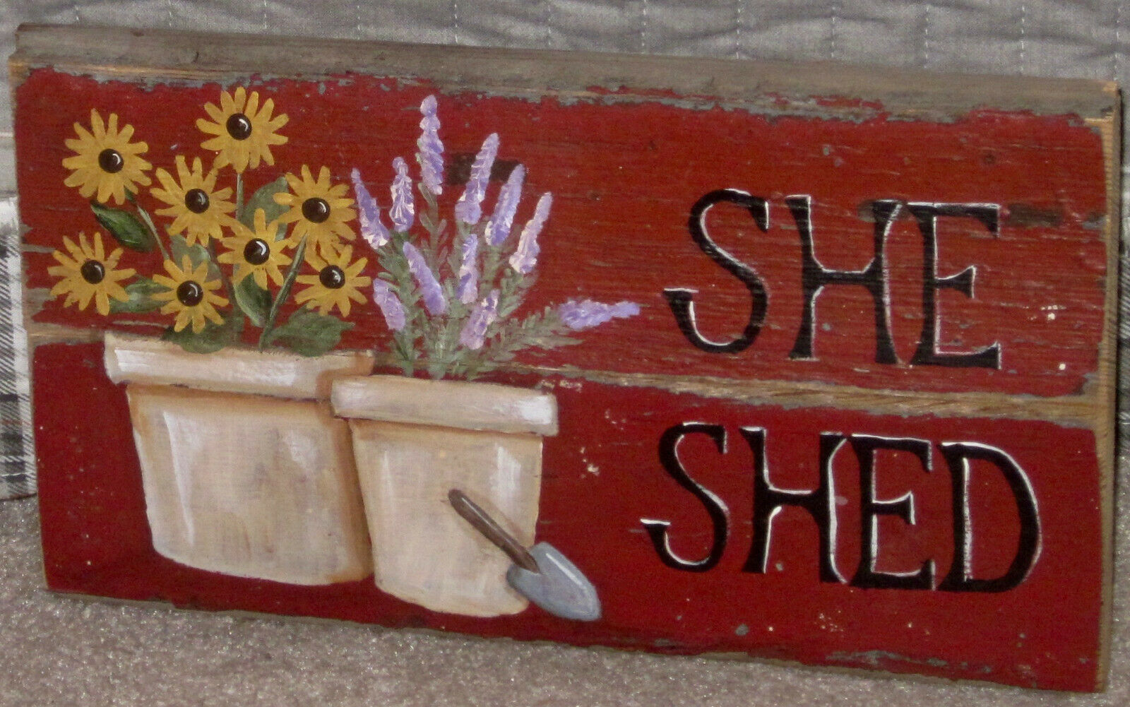 Title (ebay affiliate link): *~*PRIMITIVE*~* HP FOLK ART PRIM "SHE SHED" SIGN * SUNFLOWERS *~* RECLAIMED WOOD