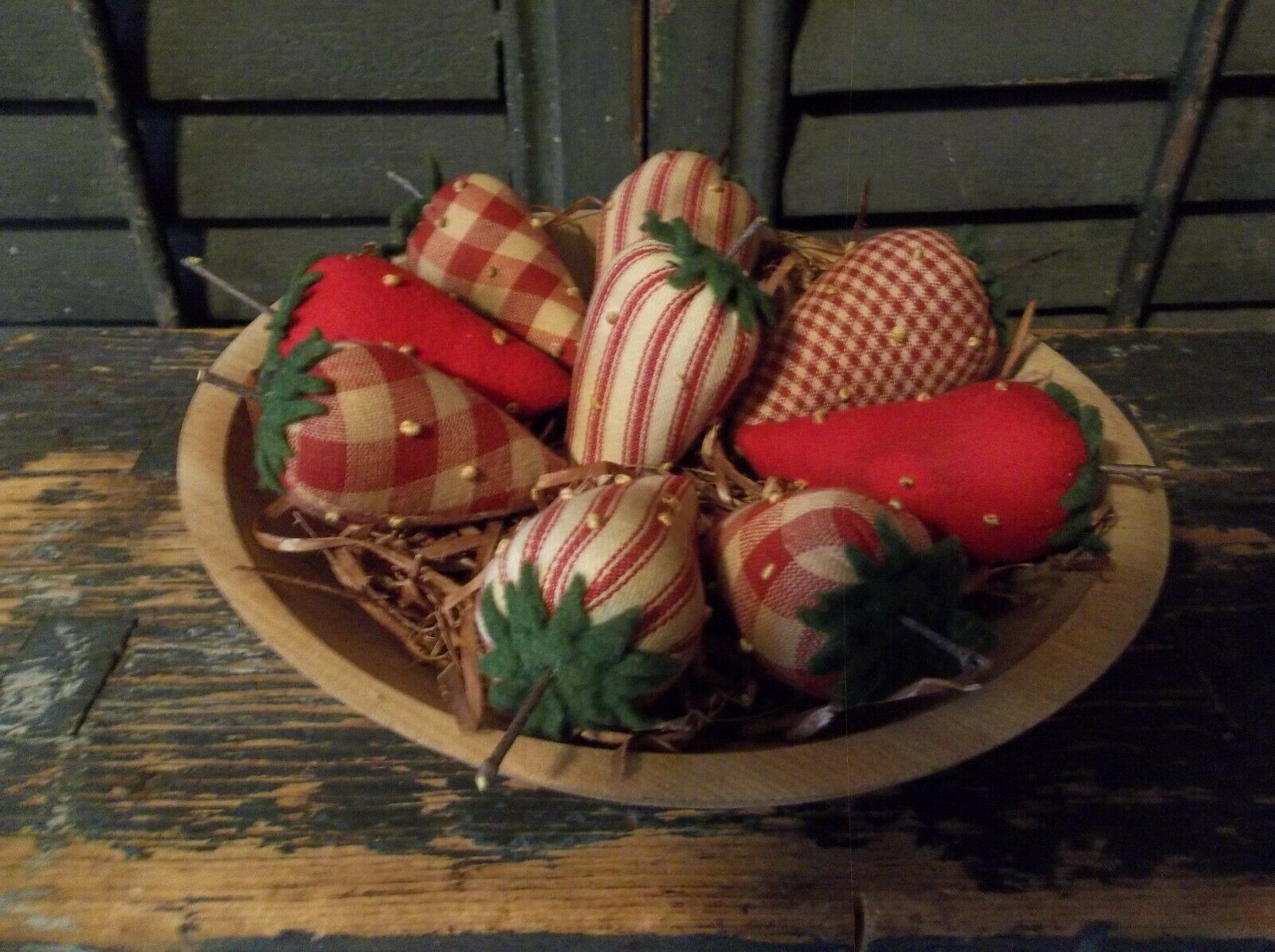 Title (ebay affiliate link): Gathering of Primitive Handmade Strawberries in Small Vintage Wood Bowl
