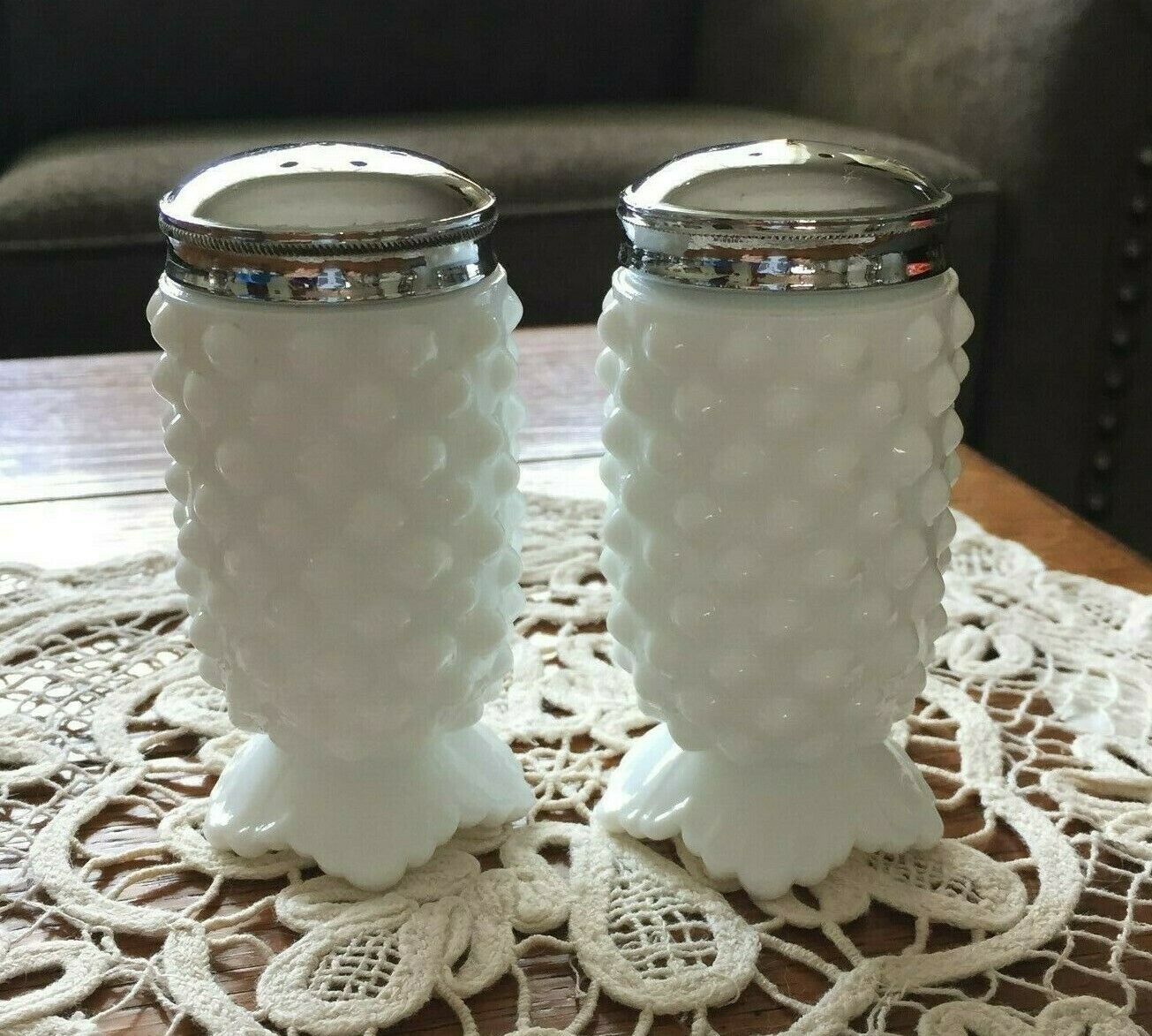Title (ebay affiliate link): FENTON Hobnail SALT & PEPPER SHAKERS White Milk Glass w Scalloped Flower Foot