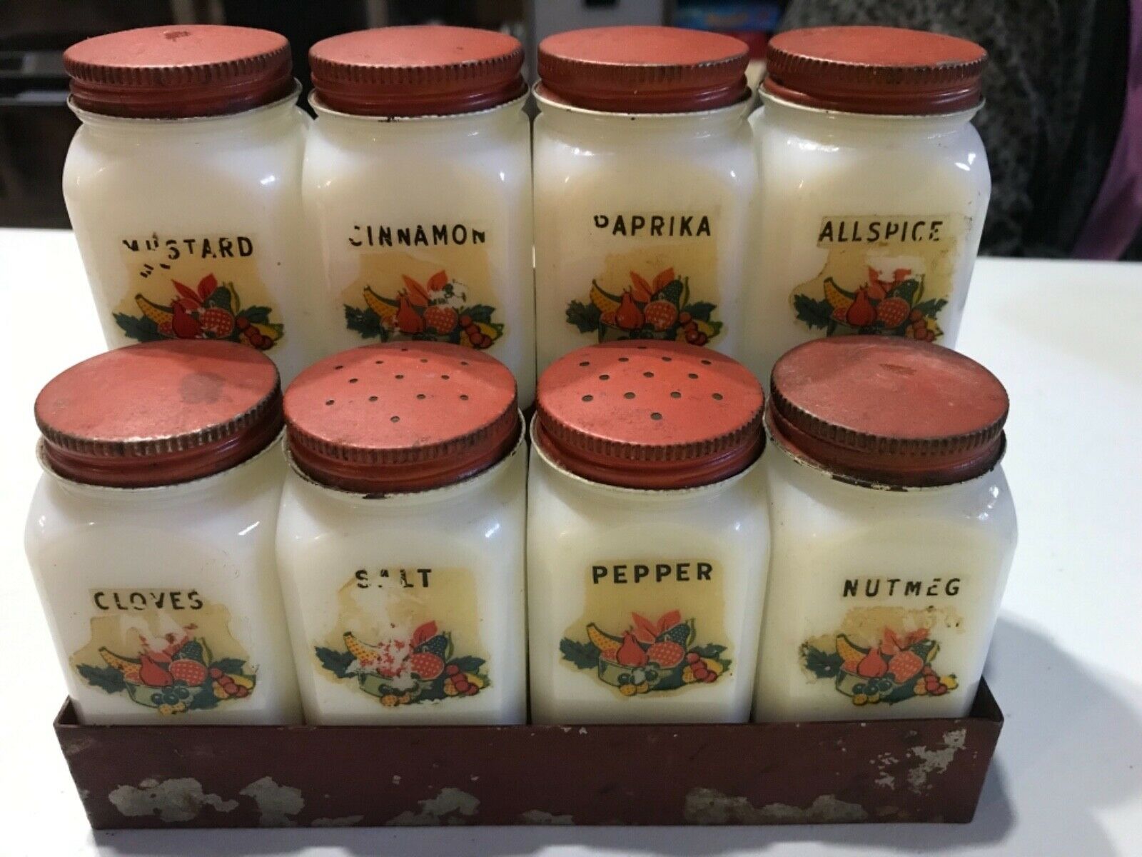 Title (ebay affiliate link): Vtg Set of 8 White Milk Glass Spice Jars w/Salt & Pepper Shakers & Metal Rack