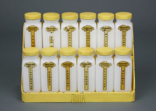 Title (ebay affiliate link): Vintage Milk Glass Spice Jars w/ Rack, Griffith Laboratories, Yellow, Set of 12