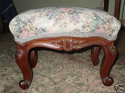 Title (ebay affiliate link): ANTIQUE HAND-CARVED WOOD UPHOLSTERED FOOT STOOL/BENCH