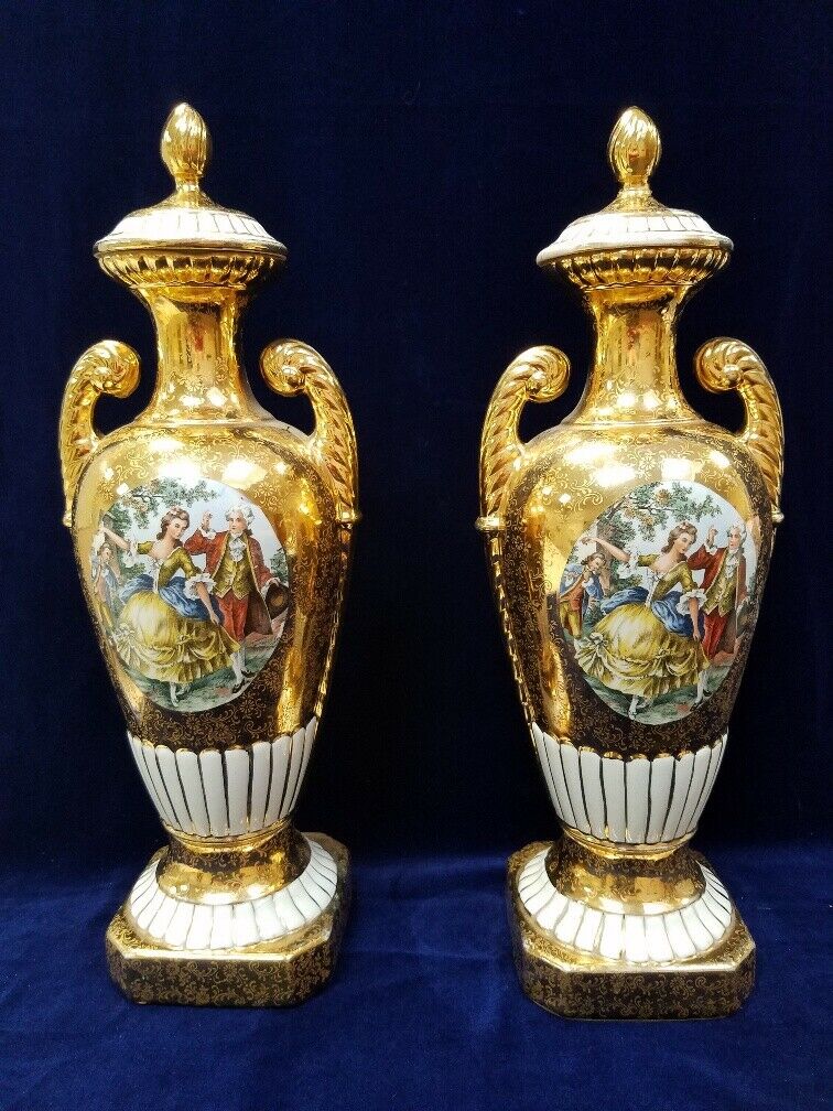 PAIR OF BEAUTIFUL VINTAGE GOLD GILT URN STYLE VASE W/COLONIAL VICTORIAN SCENE