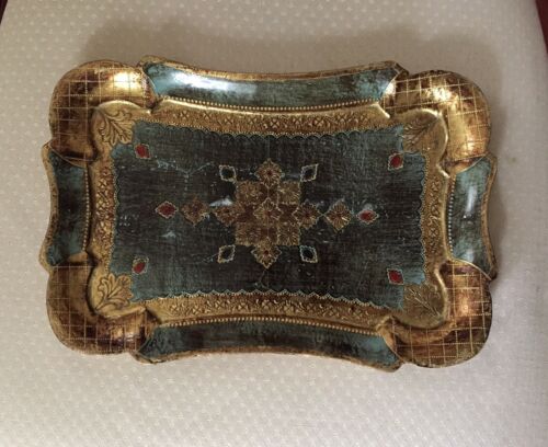 Vintage Florentine Wood Tray - Aqua & Bronze/Gold