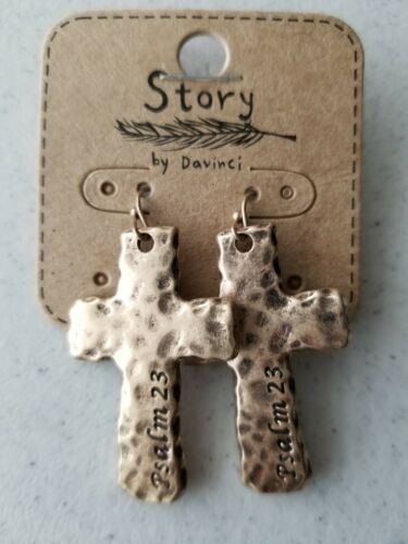Title (ebay affiliate link): Antique Burnished GOLD Tone Hammered Psalm 23 Crucifix Cross Dangle Earrings