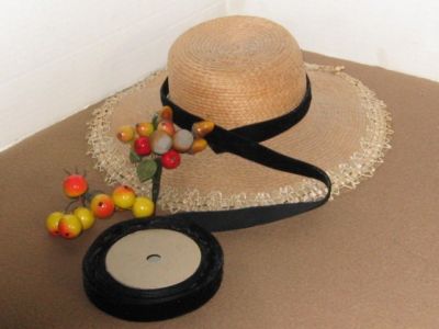 ANTIQUE NATURAL STRAW OLD DOLL HAT~10" VTG LACE TRIM
