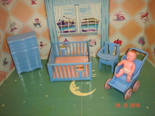 Title (ebay affiliate link): 5 Piece Grouping Vintage 1950''s Renwal Dollhouse Blue Nursery Furniture