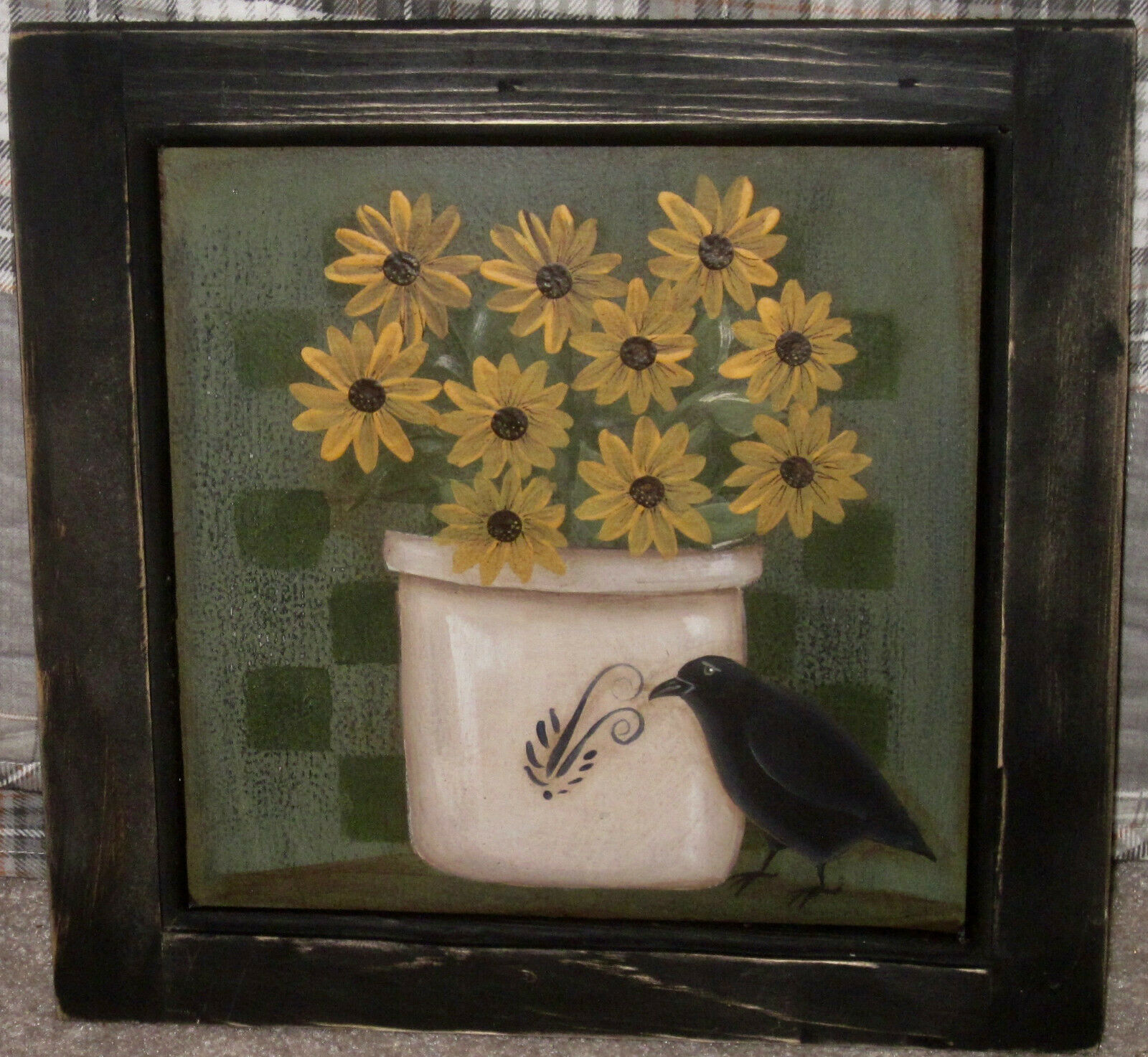 Title (ebay affiliate link): *~*PRIMITIVE*~* HP FOLK ART PRIM CROCK *~* SUNFLOWERS *~* CROW *~* DOOR PANEL