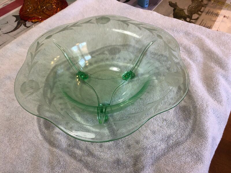 Lancaster Large Uranium Glass Etched Three Footed Bowl