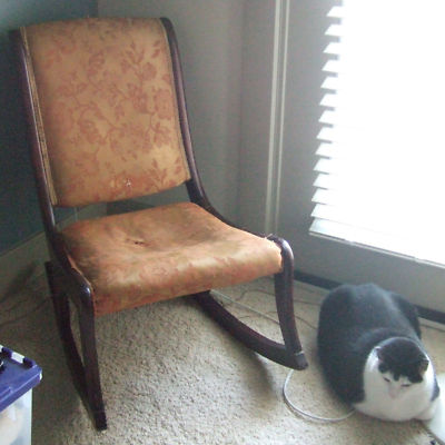 Title (ebay affiliate link): Antique Childs rocking chair, rare graceful wood fabric