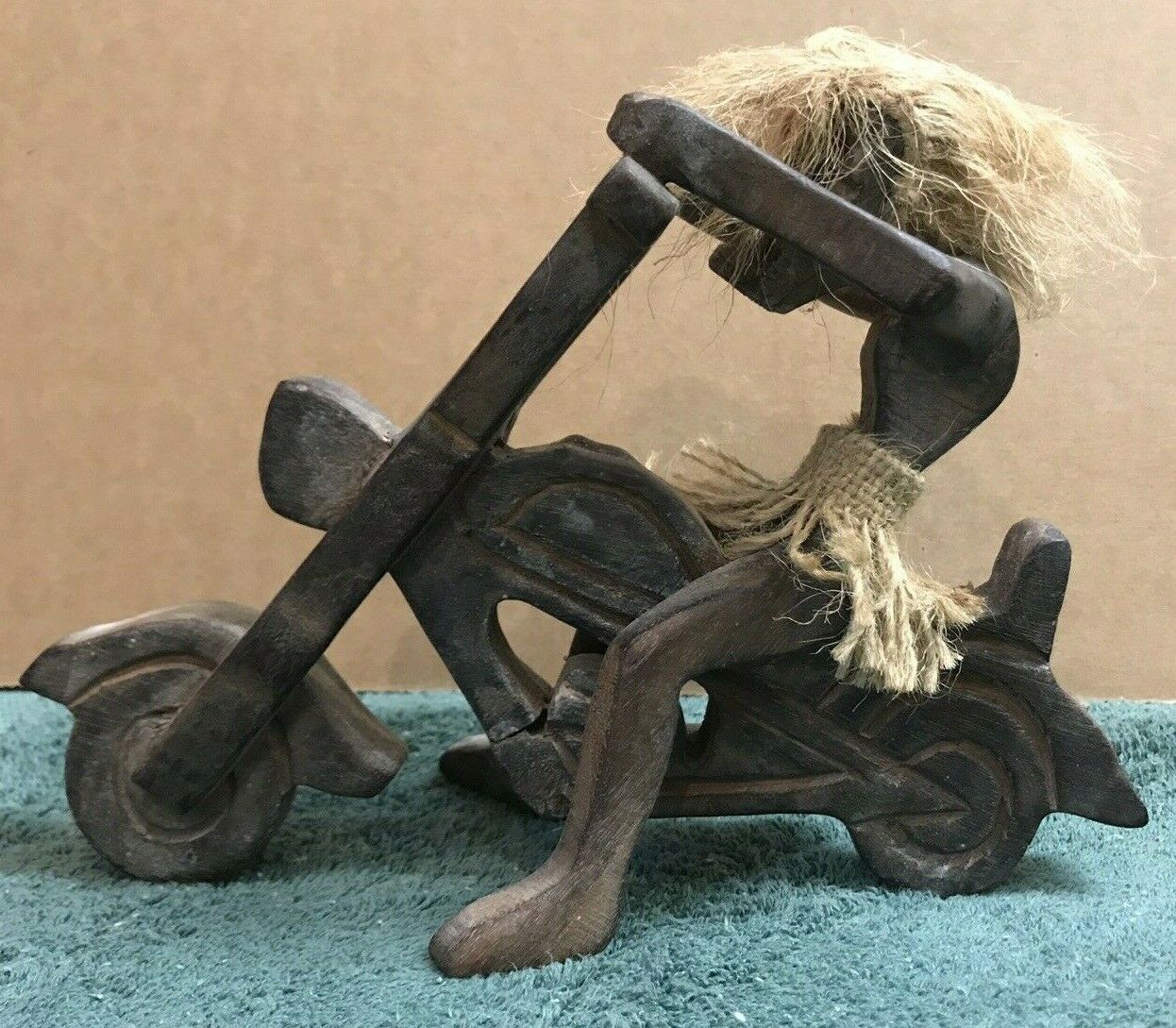 Hand Carved Wood Figurine Tribal Statue Man Riding Motorcycle Biker Tiki