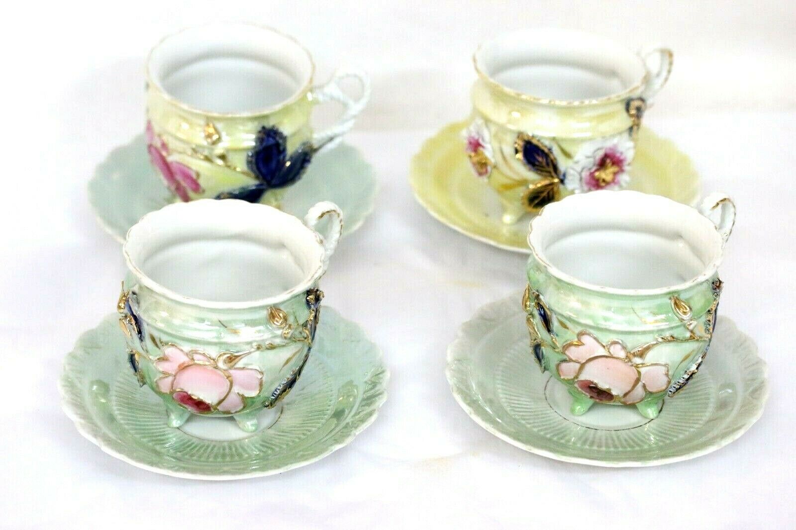 Lusterware German Raised Floral Gold Trim Footed Tea Cup & Saucer Set, Serves 4