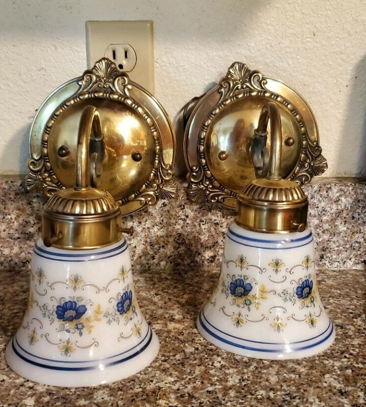 Title (ebay affiliate link): Set of Two Vintage Brass Sconces and Milk Glass Globes with Blue Flowers