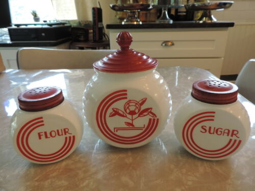 3 VTG FIRE KING VITROCK SPICE SHAKERS FLOUR SUGAR GREASE JAR DECO MILK GLASS
