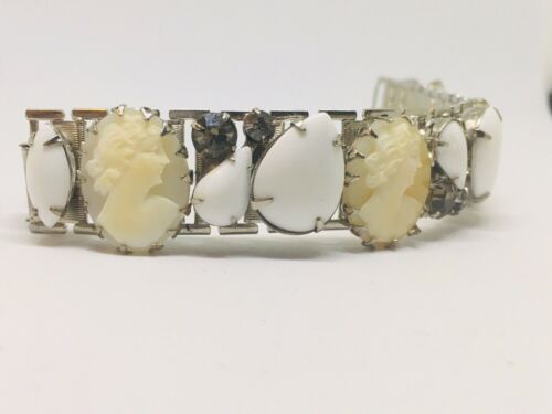Title (ebay affiliate link): Vintage Designer Carved Helmet Shell Cameo , Rhinestone & Milk Glass Bracelet