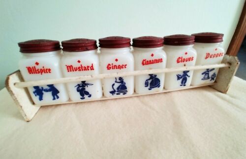 Vintage MILK GLASS 6 Piece Spice Shaker Set and Rack