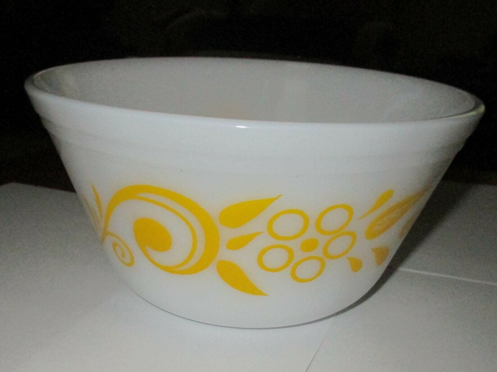 Title (ebay affiliate link): Federal Glass Bowl Milk Glass Yellow Scroll Flower 8" Diameter 4" Tall