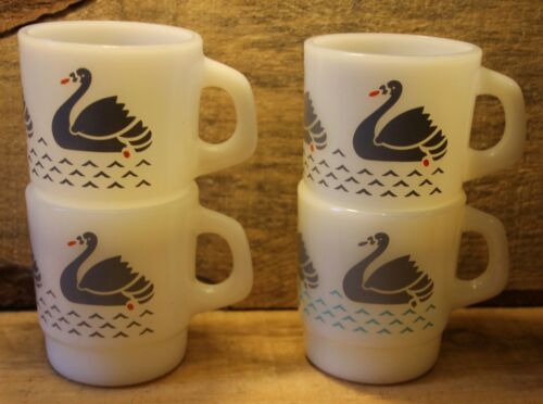 Vintage White Milk Glass Grey Swan Pattern Stackable Mugs Lot Of 4 Galaxy +