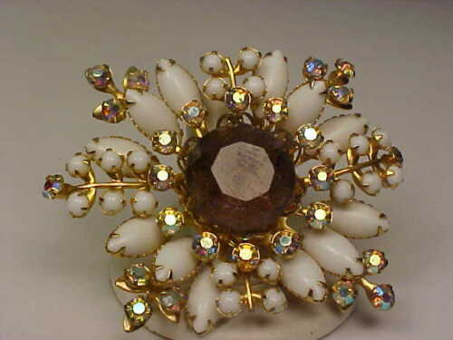 Title (ebay affiliate link): Large Vintage Goldtone & Milk Glass/AB Rhinestone Flower Brooch