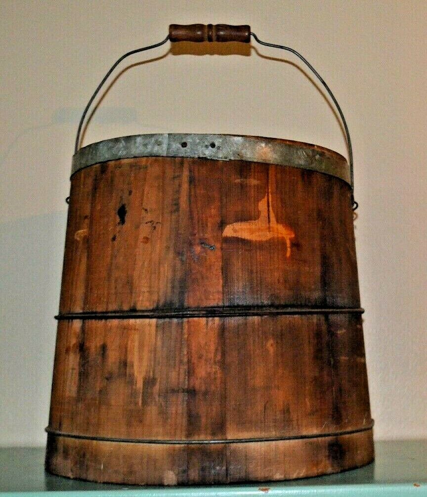 Title (ebay affiliate link): Antique Wooden Firkin Sugar Bucket Wire Swing Handle 12 1/2" Tall