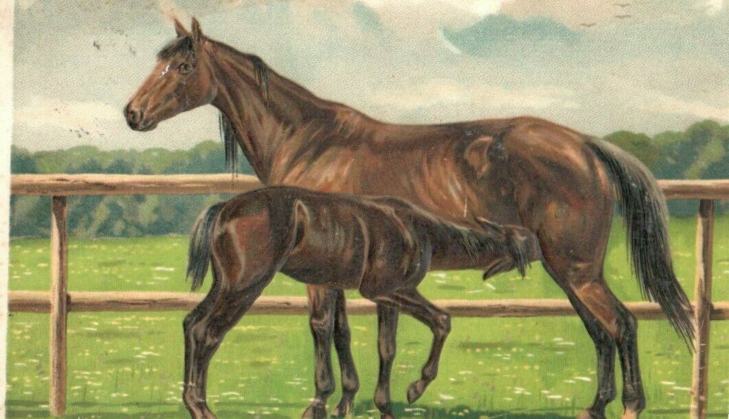Title (ebay affiliate link): VINTAGE ART postcard: HORSE & FOAL by MAILLICK surname BROOKS Shipley 1906