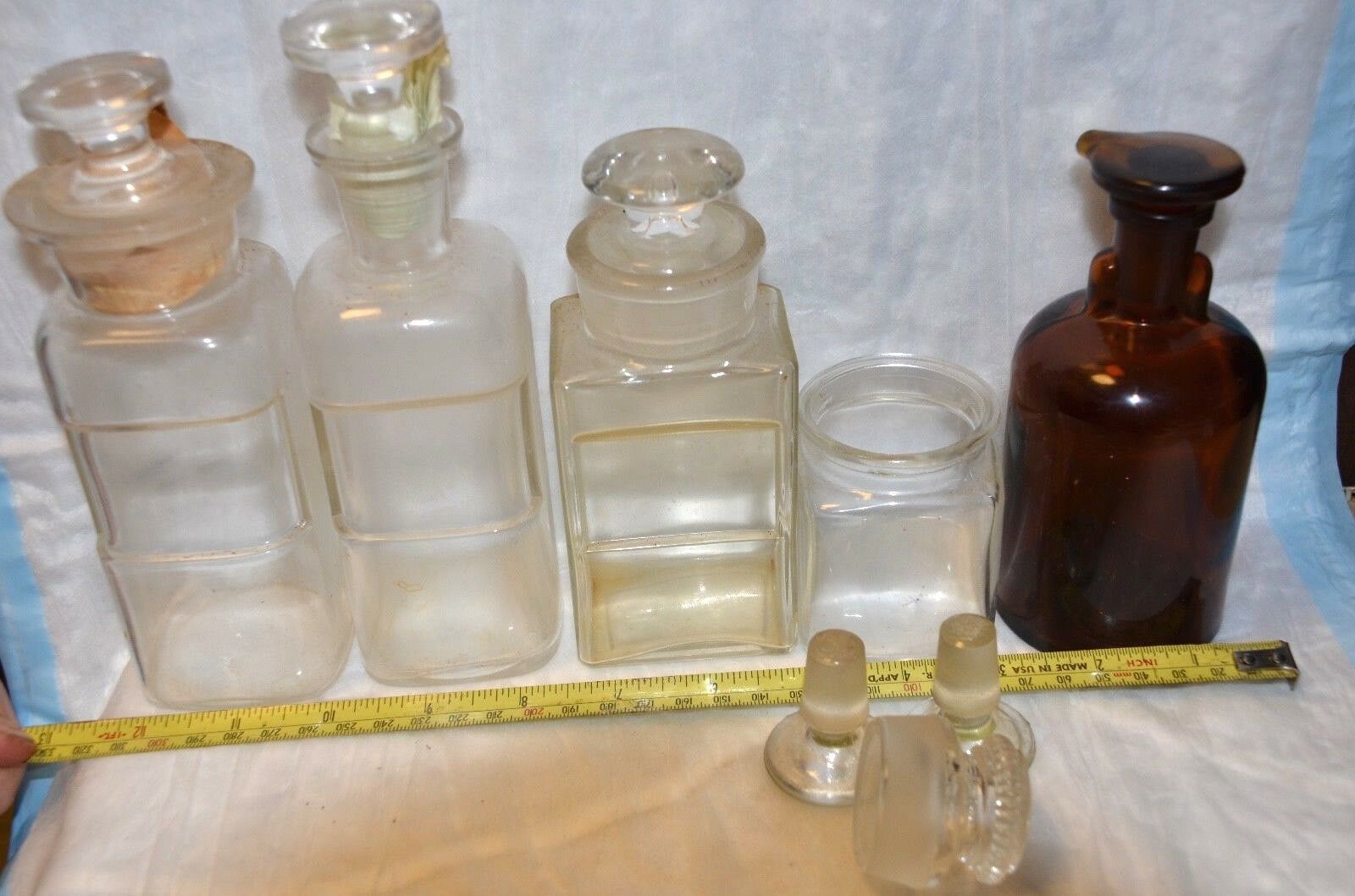 Title (ebay affiliate link): 5 Antique Embossed Apothecary Pharmacy Chemical Glass Bottles T C W Co.