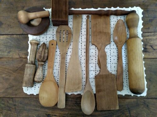 Antique Wooden Kitchen Utensils Masher Pestle Mallet Scraper lot of 13 items