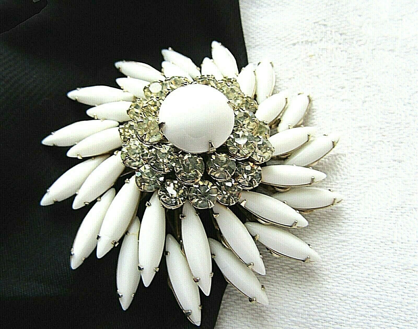 GORGEOUS 2 3/4 INCH VINTAGE JUDY LEE DIAMANTE MILK GLASS & RHINESTONE BROOCH