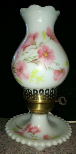Title (ebay affiliate link): Vintage Hand Painted MILK GLASS HURRICANE WORKING ELECTRIC LAMP PINK FLOWERS 11"