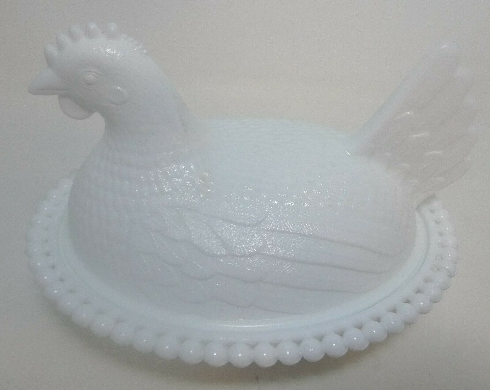 Title (ebay affiliate link): Vintage Milk Glass Hen on Nest HON Candy Dish Lid Glass Beaded Basket Weave 7"