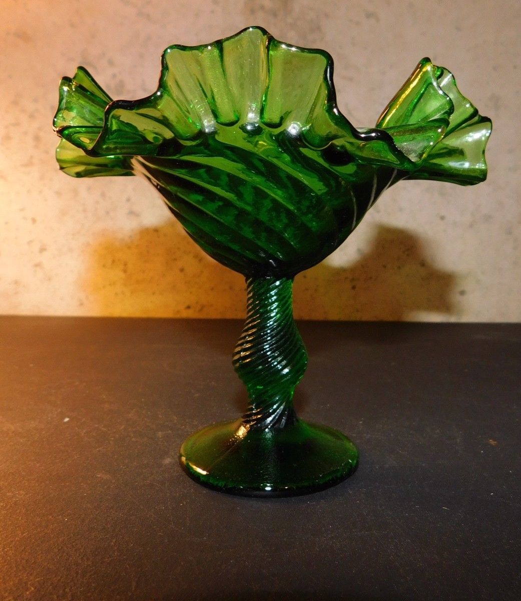 GREEN RUFFLED EDGE GLASS BOWL ON PEDESTAL