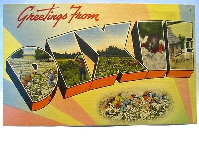 Title (ebay affiliate link): 1940s POSTCARD LARGE LETTER GREETINGS FROM DIXIE, SCENES OF BLACKS IN COTTON