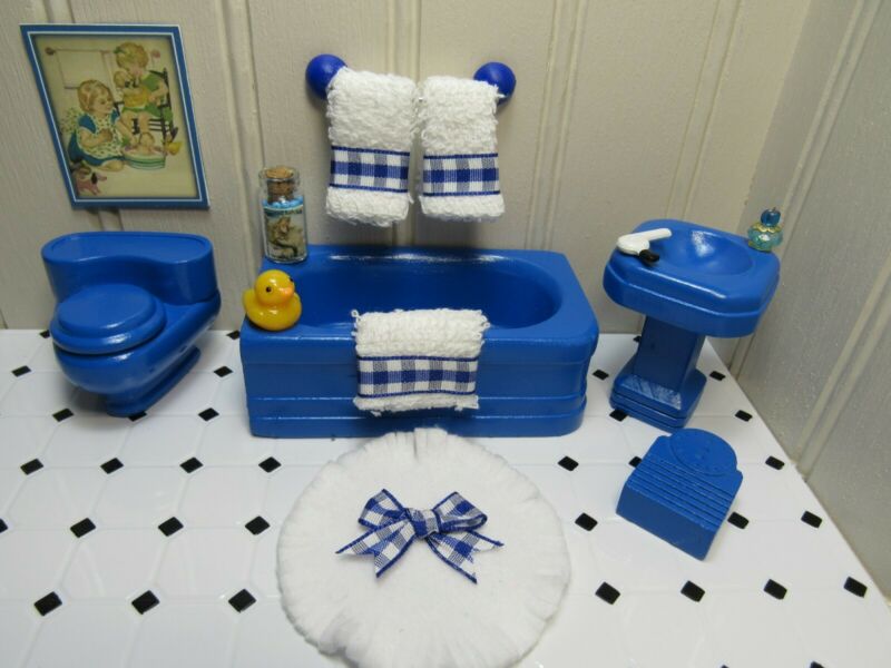 Title (ebay affiliate link): Strombecker COMPLETE BATHROOM SET, Vintage Wood Wooden Dollhouse Furniture 1:16