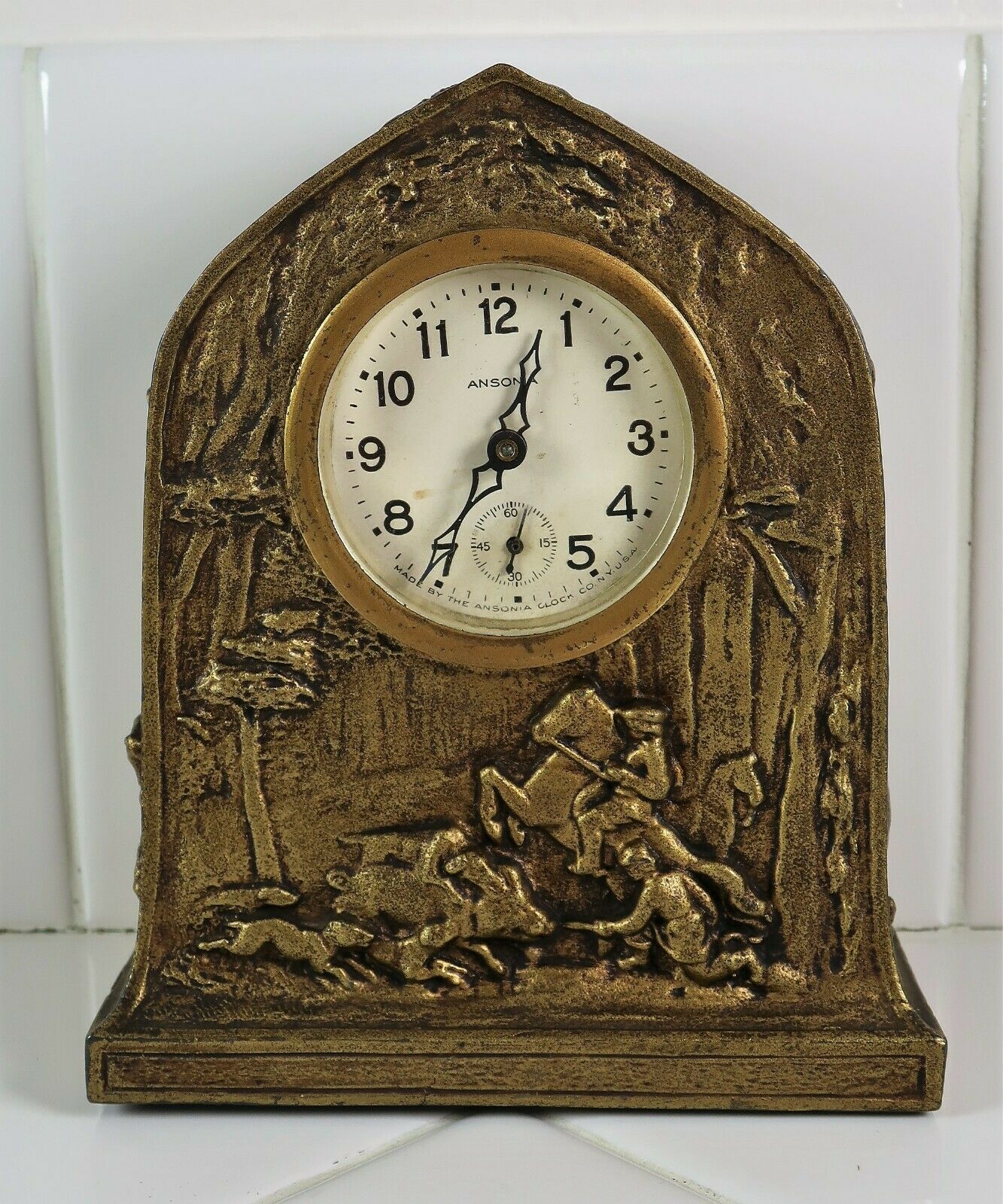 Title (ebay affiliate link): Antique Ansonia Miniature Shelf Clock Cast w/ Boar Hunting Scene - 5.5 Inches