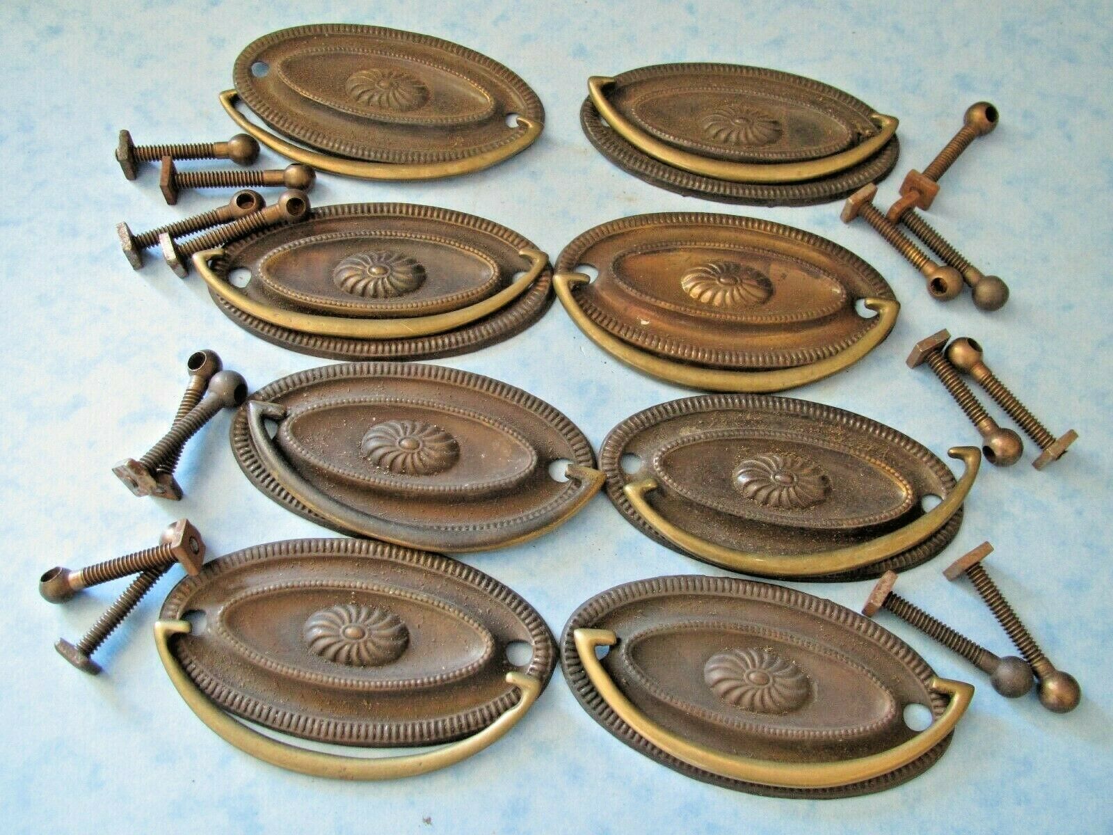 Title (ebay affiliate link): Old brass decorative oval shaped plate furniture handles x 8
